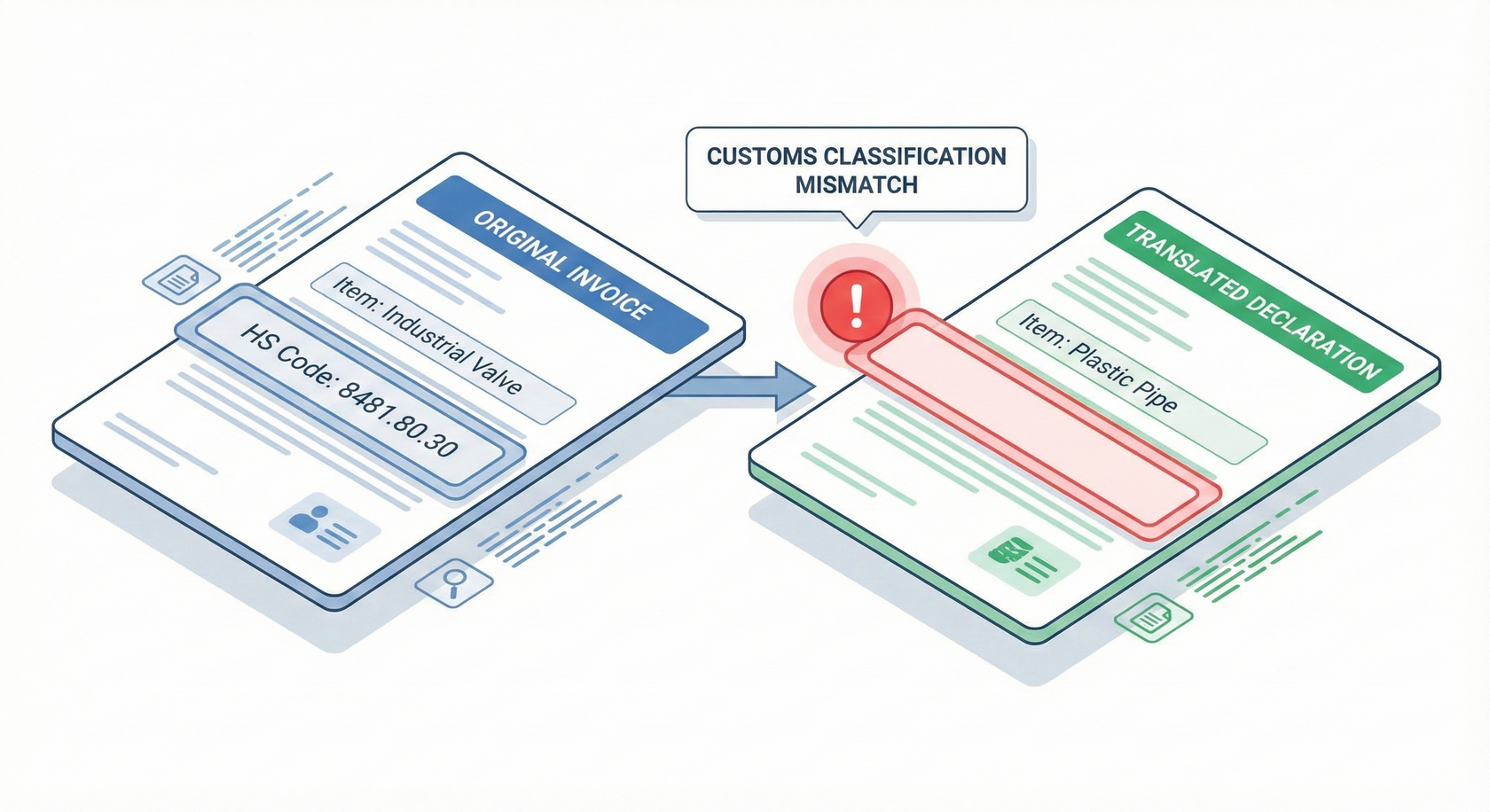 Это классика. В контракте товар назван «Office Equipment» (Офисное оборудование), а в инвойсе переводчик написал «Computer Accessories» (Компьютерные аксессуары). Для обычного человека это одно и то же. Для таможенного инспектора — это два разных товара.