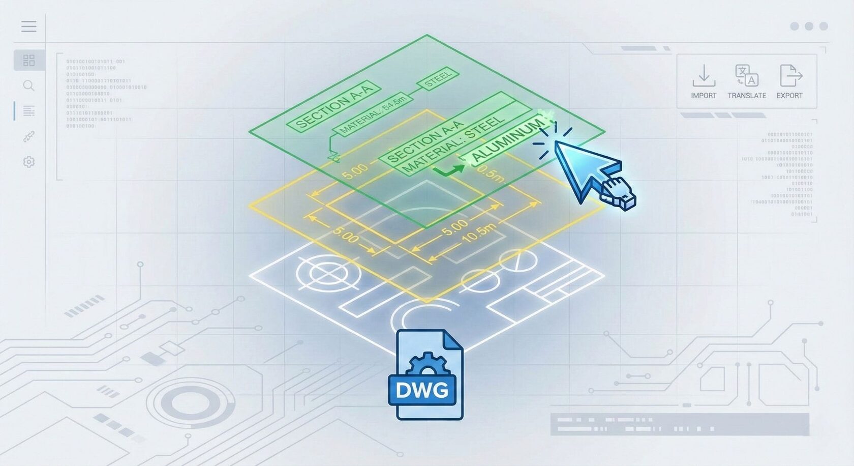 Чертеж — это сложная база данных. Текст в нем может быть разбросан по разным слоям, блокам и внешним ссылкам (Xrefs). Обычный переводчик часто не имеет установленного AutoCAD, и даже если откроет файл, может случайно удалить важную линию или размерную выноску.